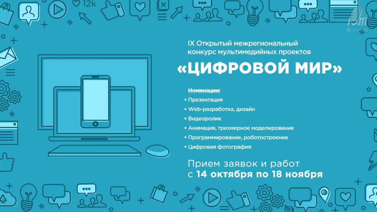 С 14 октября в ВИВТ стартовал IX открытый региональный конкурс мультимедийных проектов «ЦИФРОВОЙ МИР». Прием заявок и работ с 14 октября 2016 г. по 18 ноября 2016 г. (заочный этап), очный этап, подведение итогов и церемония награждения - 25 ноября 2016 г.